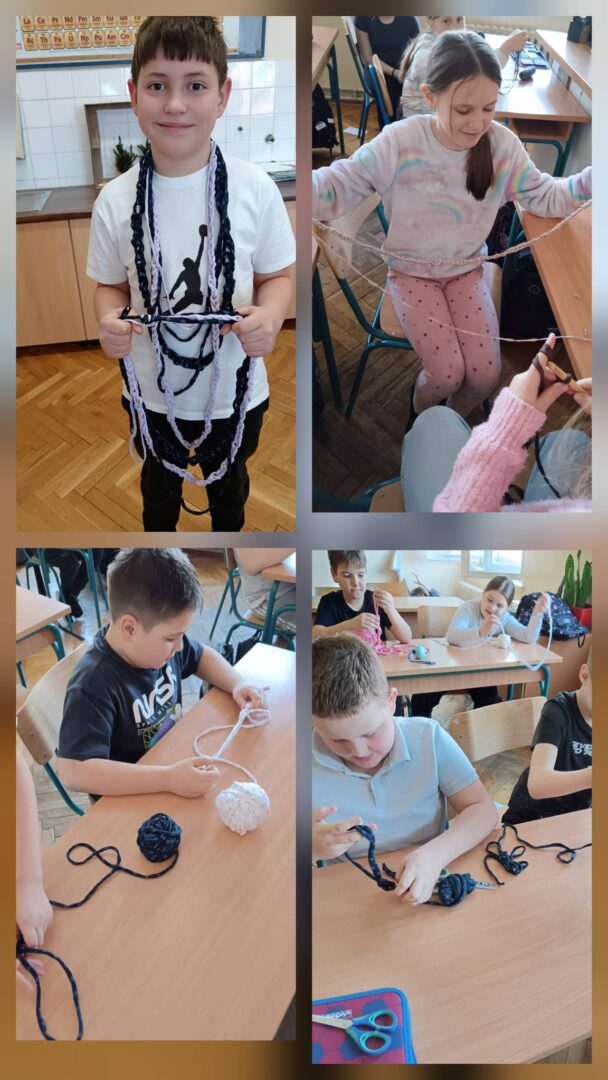 Na satu Domaćinstva u 4. razredu učenici su naučili reciklirati stare majice i od njih napraviti tekstilne trake. One su im poslužile za izradu platnenih ogrlica za mame, bake, učiteljice… Pogledajte!