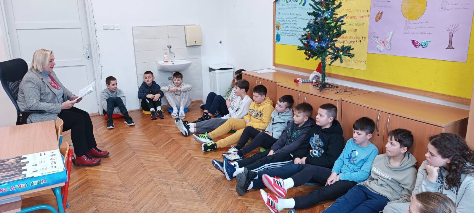 U višim razredima je teacher Rašeljka s učenicima danas čitala naglas lektirne naslove na engleskom jeziku koje upravo ovih dana obrađuju na nastavi. Vježbali su izgovor i koncentraciju te naučili nove riječi. Petaši su za vrijeme čitanja imali zadatak nacrtati neke pojmove, likove ili scene iz knjige.
